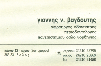 customer tabsΕπικοινωνίαLaser, δέχεται κατόπιν ραντεβού.Χειρουργοί ΟδοντίατροιΟδοντίατροιΠεριοδοντολόγοιΥγείαΕλ. Βενιζέλου 13 & Ερμού, ΒόλοςΒΟΛΟΣ ΜΑΓΝΗΣΙΑΣΜΑΓΝΗΣΙΑΘΕΣΣΑΛΙΑ 2421022795 69448866742421021450ioannis@vagdoutis.grwww.vagdoutis.gr Το προτείνω (έχει προταθεί 0 φορές) ΦωτογραφίεςFacebook LikeShare on FacebookTweet Widget